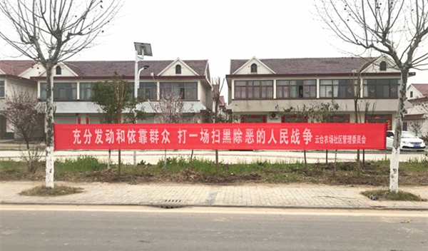 本月,云台农场社区结合自身实际情况,开展“扫黑除恶”回头看活动,为了进一步营造浓厚的扫黑除恶氛围,更好地引导全民参与,社区工作人员在场区内人员集中地段悬挂宣传横幅14