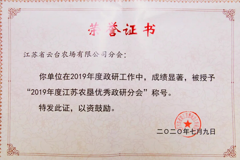 会上,云台农场公司被评为2019年度江苏农垦优秀政研分会。农场公司党委书记刘卫华上台接受省农垦领导颁奖。2019年云台农场公司择优上报集团10篇调研成果,经过专家评审《筑牢新时代云台思想政治工作的生命线》《关于加快青年员工培养的思考》 2篇论文获得二等奖;《如何做好新形势下青年员工的教育引导的培养工作》 《关于如何为企业发展做好服务的思考》 2篇获得三等奖。