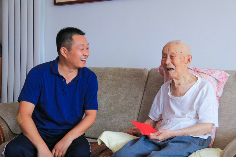 在现年102岁的抗战老兵陈如友家中,陈老精神矍铄、神采奕奕,正坐在沙发上观看电视剧《北平战与和》。刘卫华上前与陈老亲切握手,热情关切询问老人身体状况、日常起居和家庭生活情况,感谢他为党和国家抗战事业作出的贡献,祝福老人健康长寿。陈老说,“一直以来党和国家给的待遇好,组织上的关心关怀也无微不至,和牺牲的战友们相比非常幸福了,现在还想为农场再做点贡献,但年事已高,心有余而力不足了。”